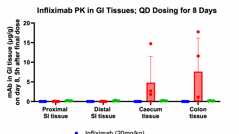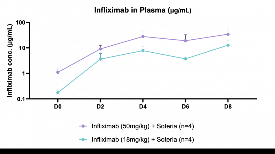 Key findings of the preclinical evaluation include demonstrating enzymatic protection of infliximab against human colon enzymes ex vivo using fresh fecal samples from healthy subjects utilizing the Soteria® platform, a proprietary formulation of natural amino acids (data not shown). Furthermore, successful delivery of TH023 in vivo into both local colonic tissue and systemic circulation was shown following intra-duodenal once-daily dosing for 1 week in a healthy mouse model at two doses of infliximab. This data shows the potential of the delivery platform to allow for both local delivery of the antibody precisely in the large intestinal tissue through enzymatic stabilization, as well as systemic circulation, which is an ideal pharmacokinetic (PK) profile for targeting both local gastrointestinal (GI) diseases such as inflammatory bowel disease (IBD) as well as systemic inflammatory diseases. The mechanism by which the antibody transcytosis occurs in the GI tract was shown to be a combination of passive, as well as mediated via the neonatal fragment crystallizable receptor (FcRn), highly expressed in distal intestinal epithelial cells enabling active transport.