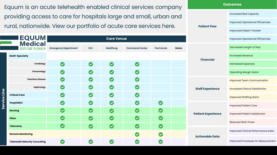 Equum Medical is a leading provider of telehealth-enabled clinical services, specializing in multi-specialty care for rural and critical access hospitals. Founded by physicians with a commitment to improving rural healthcare, Equum Medical's team of experts delivers high-quality, remote care to underserved communities, ensuring that patients have access to the specialty services they need, regardless of location.