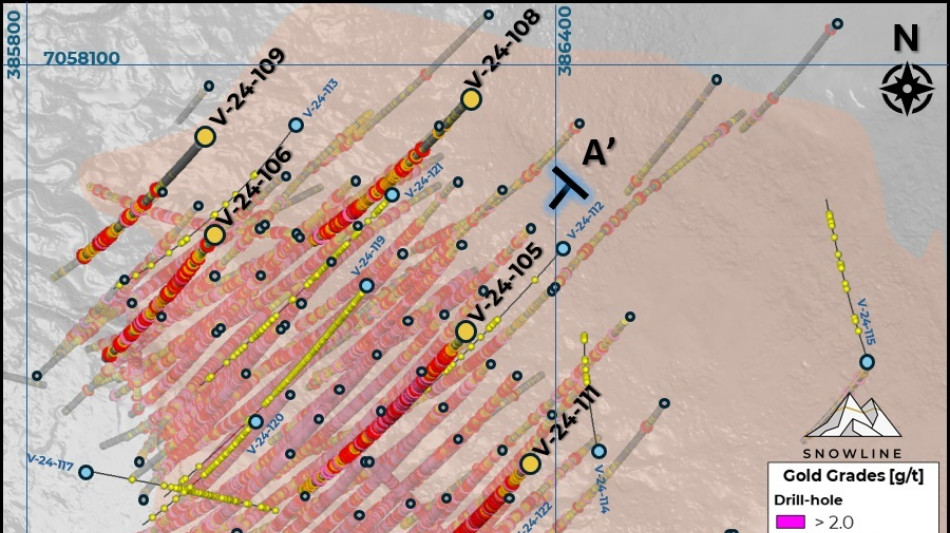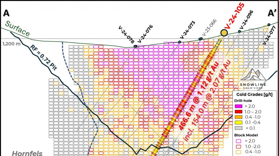 VANCOUVER, BC / ACCESS Newswire / January 30, 2025 / SNOWLINE GOLD CORP (TSX-V:SGD)(OTCQB:SNWGF) (the "Company" or "Snowline") is pleased to announce further results from its 2024 drill campaign on the Valley deposit along with analytical results at its nearby Aurelius target on the Rogue Project, Yukon. At Valley, holes V-24-105 and V-24-111 delivered strong, consistent mineralization from infill holes in gaps along the margins of the high-grade, near-surface core of the deposit. Additional expansionary holes delivered broad intervals above the cut-off grade used in the initial Mineral Resource Estimate (MRE) for Valley, including mineralization outside of the resource-limiting pit shell (e.g. V-24-108, Figure 3). These results will help to inform an updated MRE for Valley anticipated in the coming months. Results are pending for an additional >7,200 m of drilling in 17 holes across two different targets: Valley (Rogue Project) and Jupiter (Einarson Project).