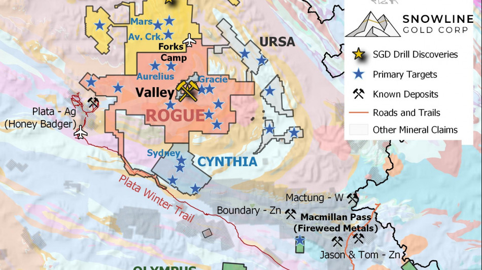 Figure 8 - Project location map for Snowline Gold's eastern Selwyn Basin properties: Rogue, Einarson, Ursa, Cynthia and Olympus. The Valley deposit and the Aurelius target are two of several prospective reduced intrusion-related gold targets on the broader 30 x 60 km Rogue Project.