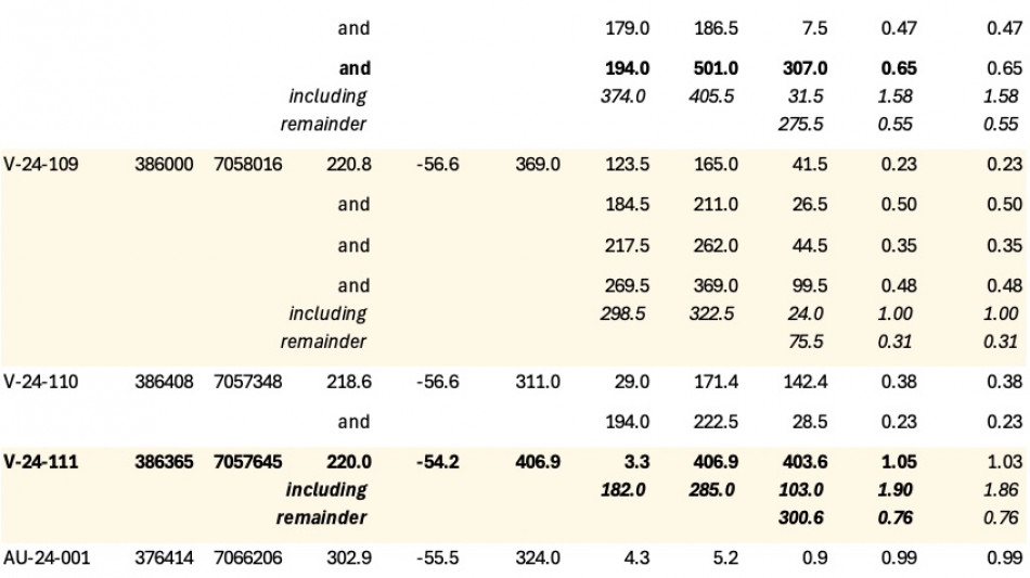 Hole V-24-111 returned 1.05 g/t Au over 403.6 m from surface, including 1.90 g/t Au over 103.0 m from a 108 m gap along section near the eastern extent of drilling