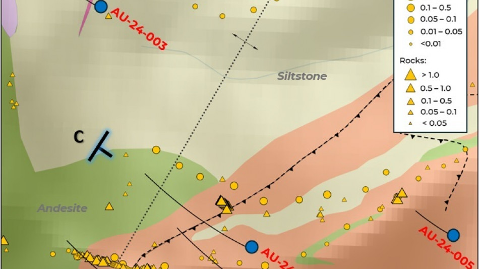 Figure 5 - Plan view of Aurelius drill holes from 2024 atop geological mapping and surface geochemical results. The 2024 drill program at Aurelius was the first ever drill test of the target, which covers a broader 2 km by 500 m footprint (Figure 6). A schematic cross section including AU-24-002 and AU-24-004 is shown in Figure 7.