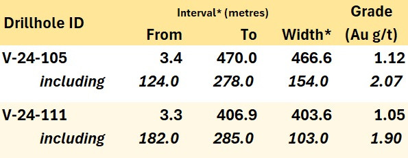 Hole V-24-105 returned 1.12 g/t Au over 466.6 m from surface, including 2.07 g/t Au over 154.0 m, strong results infilling a 120 m gap along section