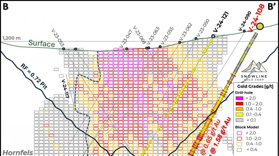 Figure 3 - Cross-section B-B', showing V-24-108 in the context of the initial Valley MRE block model and MRE-constraining revenue factor 0.72 pit shell. Note that most of the mineralization in the hole is outside the current resource-limiting pit shell. The block model has not been updated to reflect the current results, nor any results to date from 2024 (bold labels). Blocks shown outside of the current pit shell constraint are not included in the initial MRE for Valley. Areas without blocks have not been modelled and were assumed as nil for the initial Valley MRE. Instances of visible gold in holes still awaiting assay results are marked by yellow spheres.
