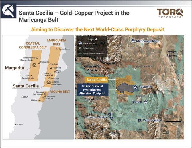 VANCOUVER, BC / ACCESS Newswire / February 27, 2025 / Torq Resources Inc. (TSXV:TORQ)(OTCQB:TRBMF) ("Torq" or the "Company") is pleased to announce the commencement of drilling at its Santa Cecilia gold - copper project located in the world-class Maricunga belt in northern Chile, approximately 100 kilometres (km) east of the city of Copiapo. The Santa Cecilia project is in the vicinity of the Norte Abierto project, held by Newmont and Barrick, which is comprised of the Caspiche and Cerro Casale gold - copper porphyry deposits (Figure 1). The planned drilling will focus on the Pircas Norte and Gemelos Norte targets, where the Company intercepted broad gold and copper mineralization including 120 metres (m) of 1.33 g/t gold and 0.096% Copper in drill hole 24SC-DDH-005; 498m of 0.36 g/t gold and 0.08% copper in drill hole 24SC-DDH-003; and 98m of 0.18 g/t gold and 0.043% copper in drill hole 24SC-DDH-004 (See news releases dated May 23 and April 18, 2024) (Figure 2). Importantly, both drill holes at Pircas Norte, 24SC-DDH-005 and 24SC-DDH-003, ended in mineralization and the reported intercepts remain open, thus one of the primary goals of the current program will be to extend drill hole 24SC-DDH-005 (Figure 3). The program will comprise five to seven drill holes for approximately 4,000m utilizing two drill rigs (Figure 2) as part of Gold Fields' initial USD$6 million funding commitment to the project.