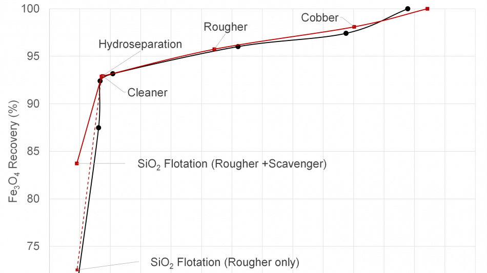 These processing steps led to the production of a concentrate grading 67% iron 1.8% silica for an economic magnetic iron recovery of +72%. The addition of a scavenger flotation circuit further improved the global economic magnetic iron recovery to +83% (+68% total iron), representing a significant enhancement compared to the initial results, as shown in the table below: