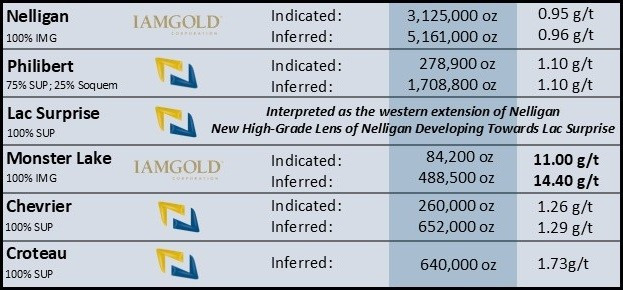 The Philibert Project is located 9 km from IAMGOLD Corporation's Nelligan4 Gold project. Philibert hosts a maiden 43-101 inferred resource of 1,708,800 ounces Au and an indicated resource of 278,900 ounces of Au.5 Northern Superior holds a majority stake of 75% in the Philibert Project, with the remaining 25% owned by SOQUEM, and retains an option to acquire the full 100% ownership of the project. Chevrier hosts an inferred mineral resource of 652,000 ounces Au (underground and open pit) and an indicated mineral resource of 260,000 ounces Au.6 Croteau hosts an inferred mineral resource of 640,000 ounces Au.7 Lac Surprise hosts the Falcon Zone Discovery, interpreted to be the western strike extension of IAMGOLD Corporation's Nelligan Gold project.