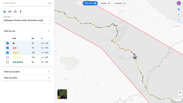 Bei der Sternbewertungsmethode von iRAP wird ein prädiktiver, risikobasierter Ansatz zur universellen Bewertung von Straßen verwendet, wobei die entlang der Straße vorhandenen Merkmale überprüft werden. Die zeitaufwändige traditionelle Methode zur Durchführung einer iRAP-Sternbewertung umfasst die manuelle Überprüfung von Videoaufnahmen der Straße durch akkreditierte Codierer alle 100 m sowie die Codierung von über 50 Straßenmerkmalen. Diese Merkmale werden anschließend mit der ViDA-Software von iRAP verarbeitet, um eine objektive Sternebewertung des Sicherheitsniveaus für Fahrzeuginsassen, Motorradfahrer, Radfahrer und Fußgänger zu erhalten. Um diesen Prozess zu skalieren, hat iRAP im Jahr 2019 AiRAP eingeführt, was für die „beschleunigte und intelligente" (accelerated and intelligent) Erfassung von Verkehrssicherheitsdaten steht. Erfahren Sie mehr über AiRAP unter: www.irap.org/airap.